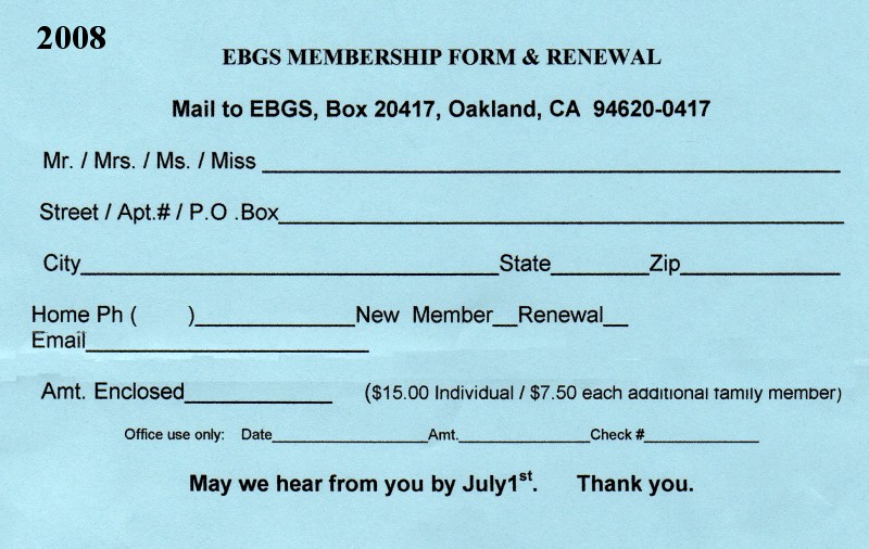 Membership in EBGS includes a subscription to The Live Oak, a membership roster, and the right to vote on matters affecting the society. Annual dues: $18.00 for an Individual or organization, Family $25 or Foreign $20. You may print out a memberhsip form and mail it along with your remittance to: East Bay Genealogical Society, PO Box 1648, Alameda, CA 94501